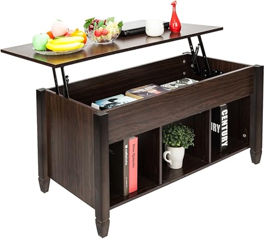 The storage spaces are hidden under the tabletop that can be lifted.